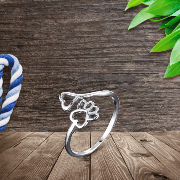 Anel Ajustável de Prata Esterlina em Forma de Coração com Impressão de Pata Feito à Mão