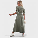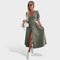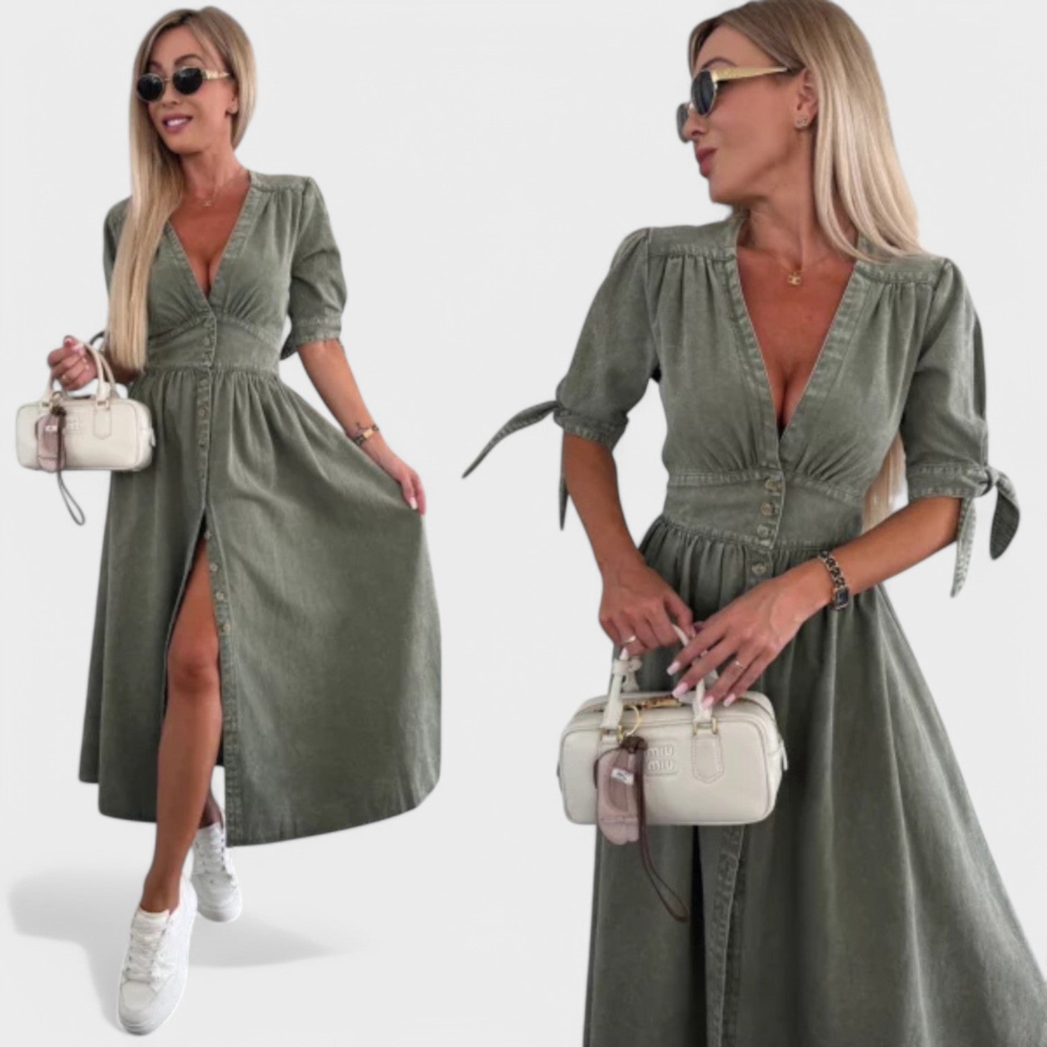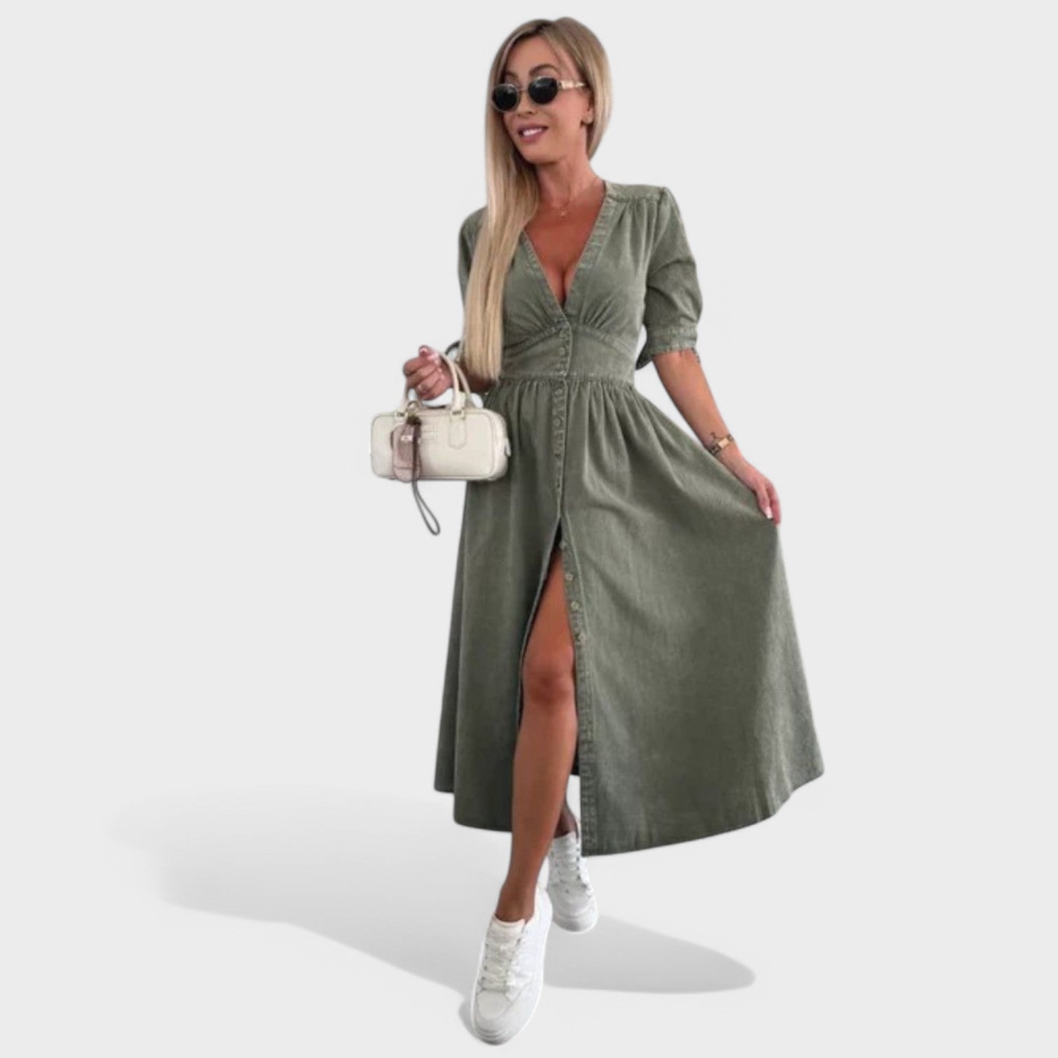 • Versatilidade – A cor verde oliva e o tecido tipo jeans tornam este vestido fácil de combinar. Ele pode ser usado com tênis para um look casual ou com saltos para um visual mais elegante.