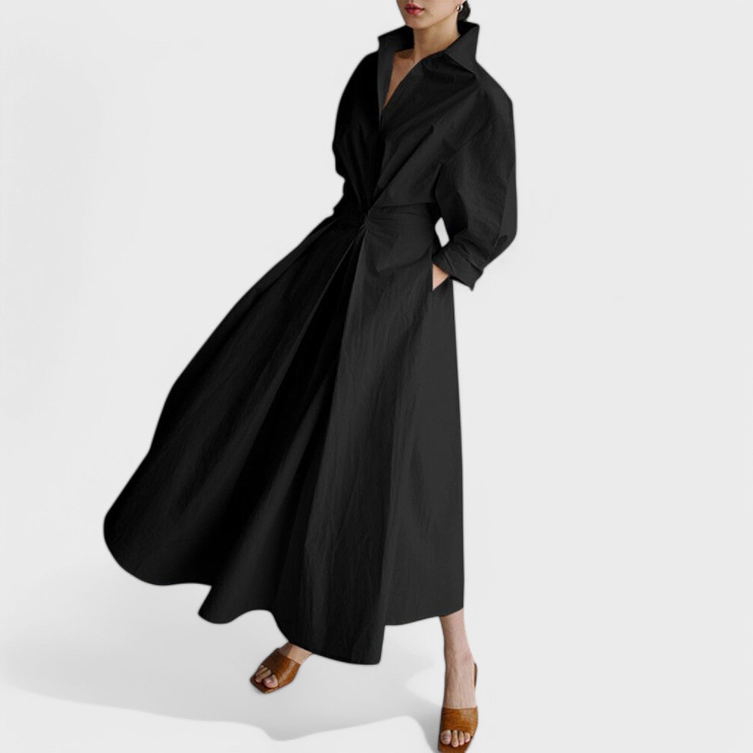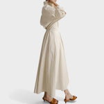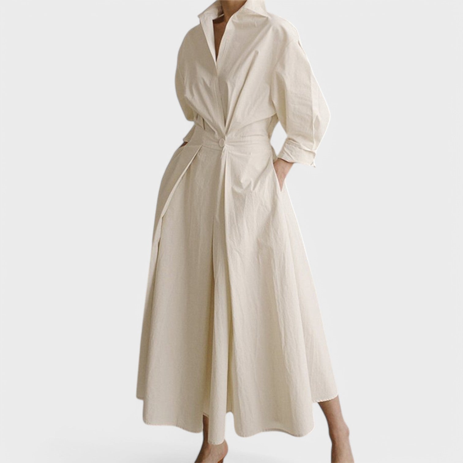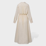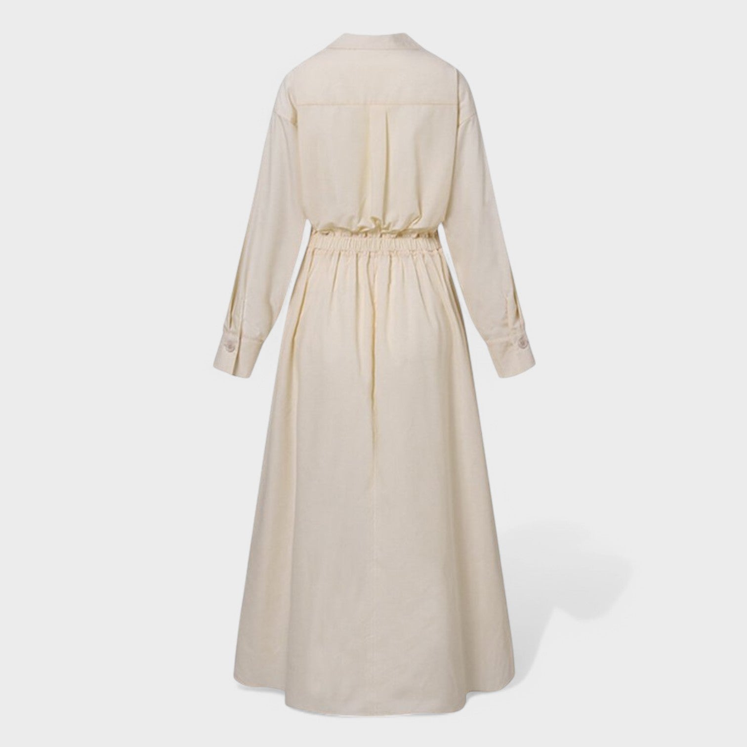 Este vestido camiseiro bege é a expressão perfeita de um estilo elegante e descomplicado. Com corte midi, cintura marcada e gola estruturada, valoriza a silhueta de forma subtil e moderna. O tecido leve, com textura natural, proporciona conforto e fluidez, ideal para dias de primavera e verão. Um look versátil que transita com facilidade do dia para a noite, do casual ao mais requintado.