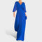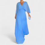 Este vestido é puro requinte. Com um corte fluido e plissado que favorece a silhueta, mangas amplas e um decote em V sofisticado, é a escolha perfeita para ocasiões especiais. Leve, confortável e com um caimento impecável, garante uma presença marcante e cheia de classe — sem esforço.
