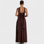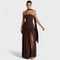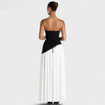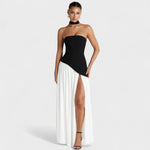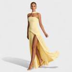 Este vestido redefine o luxo com sua estética limpa e corte arquitetônico. O design sem alças valoriza os ombros e a postura, enquanto a fenda frontal poderosa equilibra sensualidade com sofisticação.