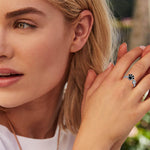 Este elegante anel de patinha artesanal é um belo tributo ao amor incondicional entre humanos e animais. Cuidadosamente desenhado, combina uma impressão de patinha de pedra preciosa preta brilhante com uma patinha de prata polida em uma banda aberta e ajustável – um design único e tocante.