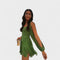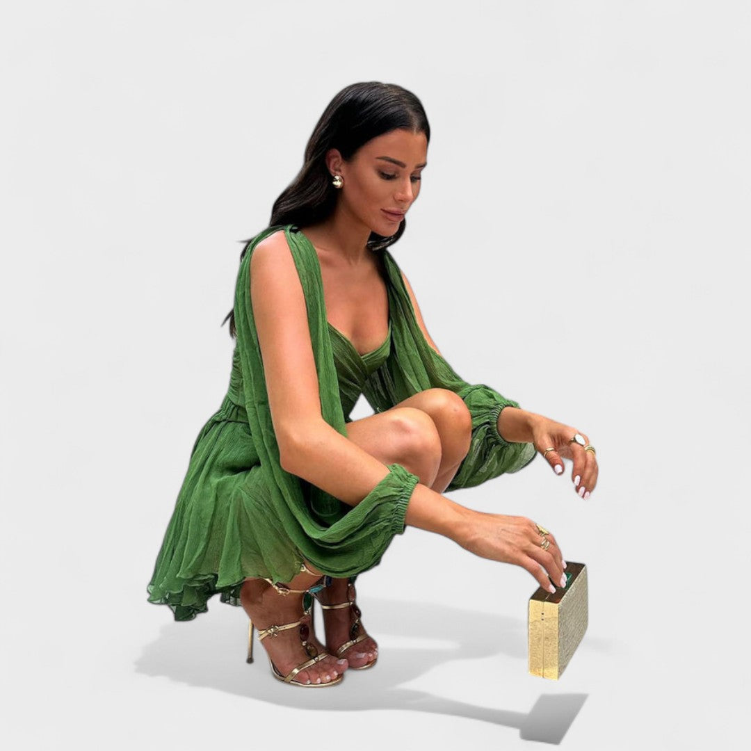 • Design Exclusivo: O corte fluido com mangas soltas e saia rodada confere um visual único e refinado.