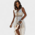A silhueta esvoaçante do vestido Érica e o seu elegante padrão rendado tornam-no uma escolha versátil, perfeita para transitar do dia para a noite, sempre com um toque boho intemporal.